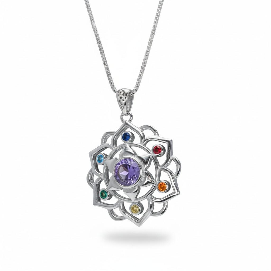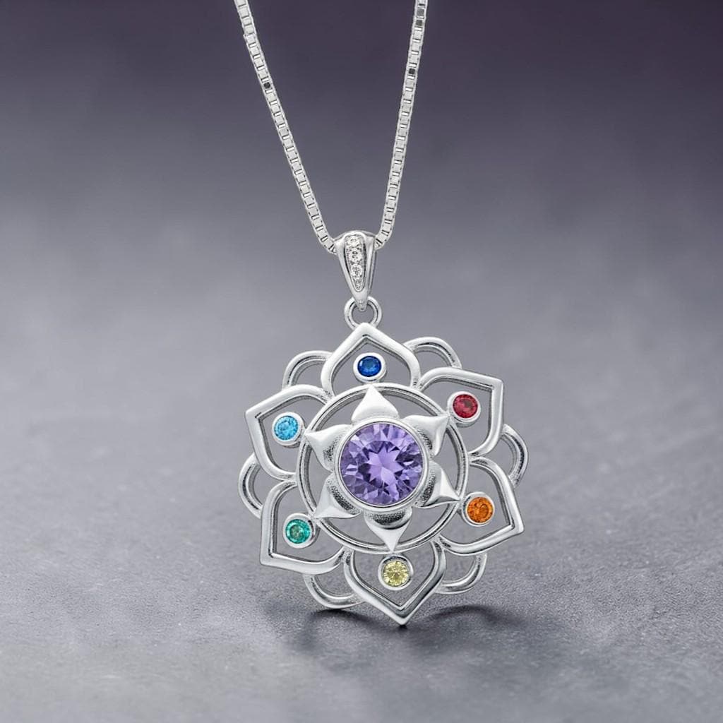 The 7 chakra necklace represents the 7 spiritual forces in the human body, including the physical elements of the earth, water, fire, air & ether (space), and the elements of light and cosmic energy.