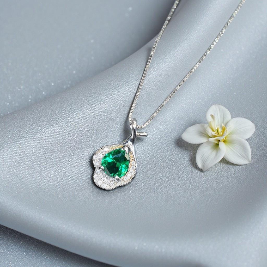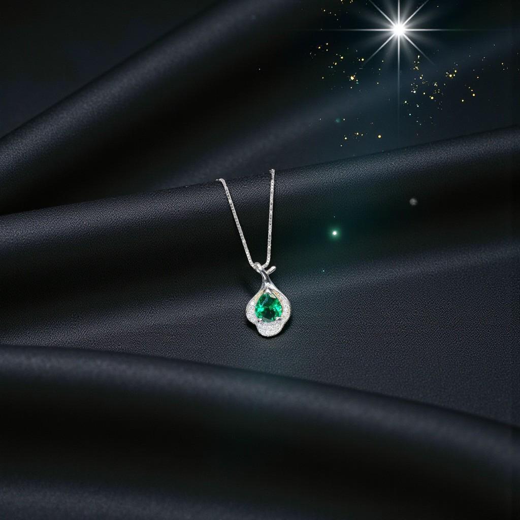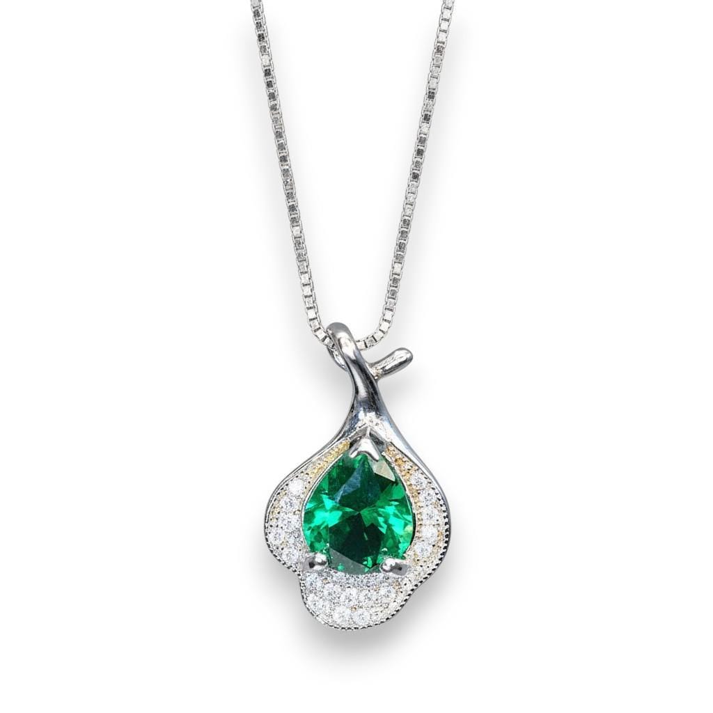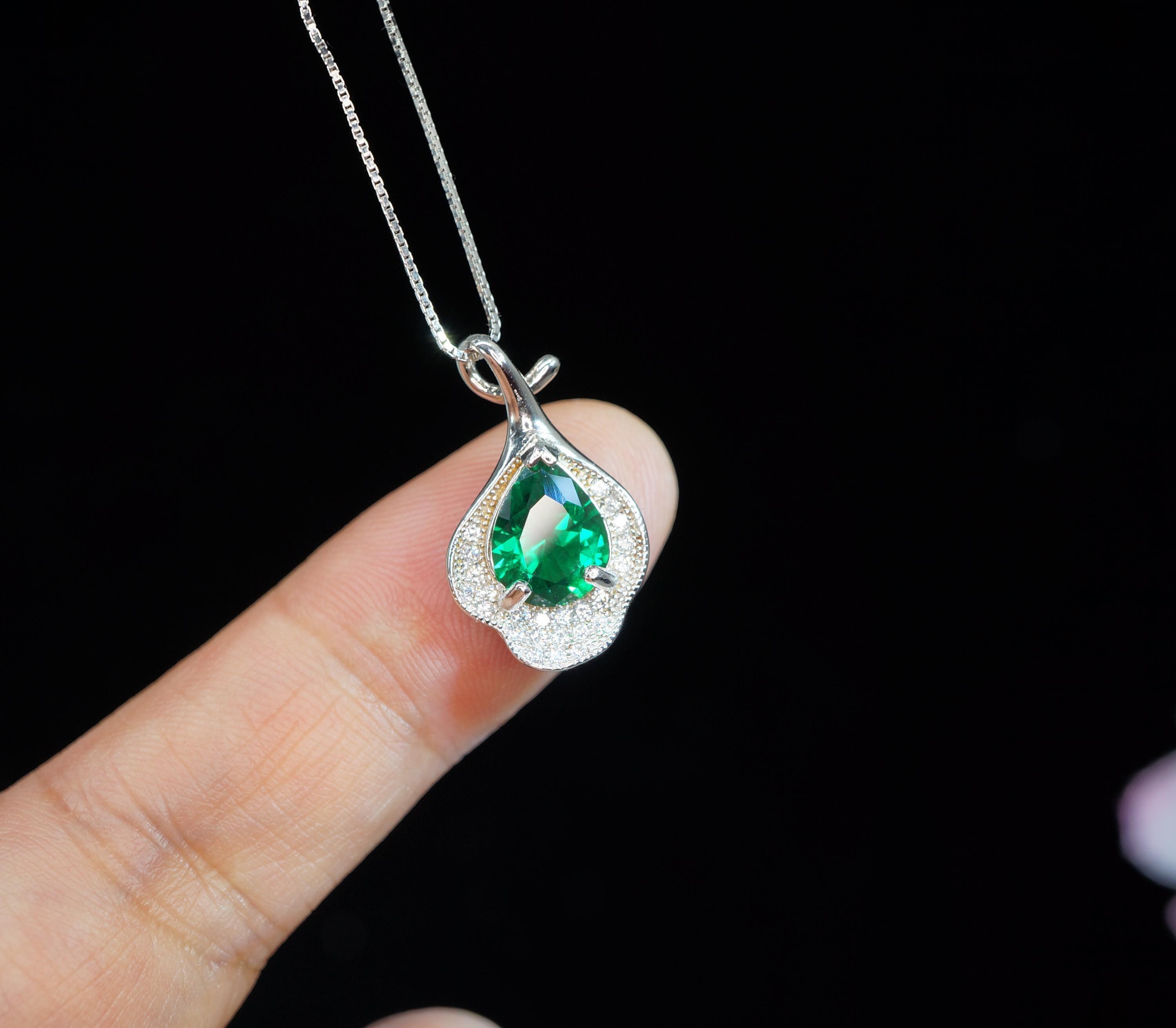 What it is: A breathtaking 2ct lab-created pear-cut emerald pendant set in a white gold-plated sterling silver frame with a delicate halo of accent stones.