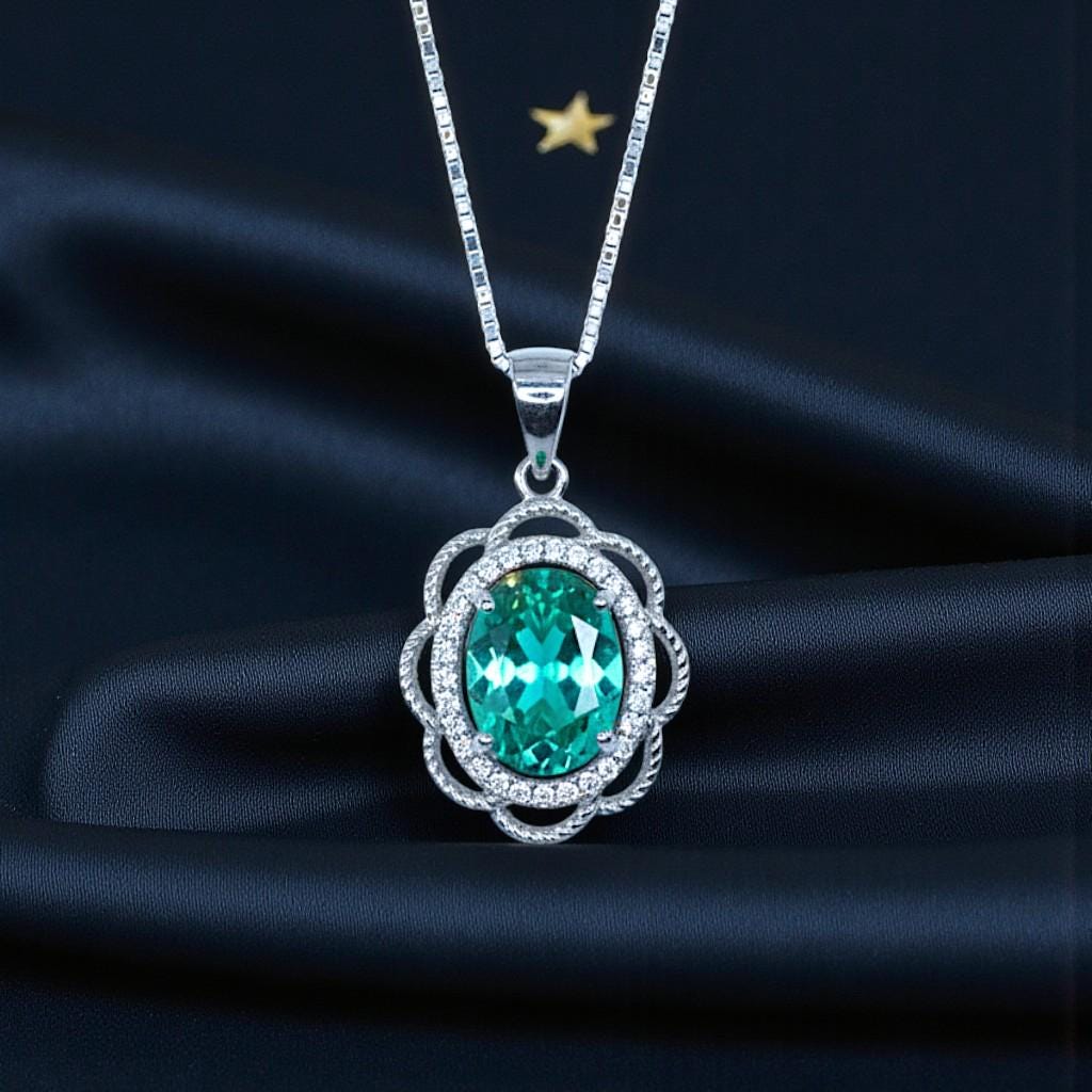 Product Details: A vibrant $7 \times 9\text{mm}$ lab-created Paraiba tourmaline pendant, featuring a stunning neon hue and a vintage-inspired floral silver frame.