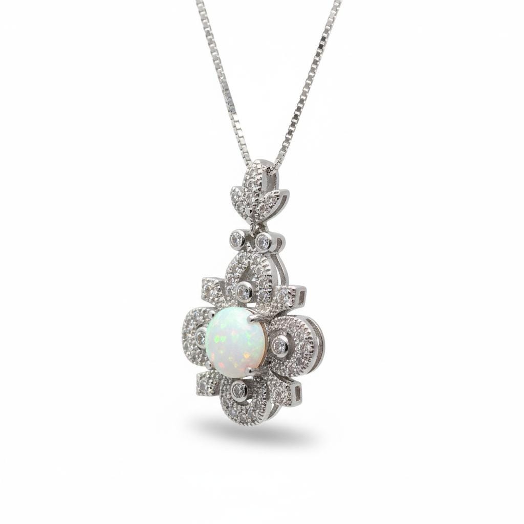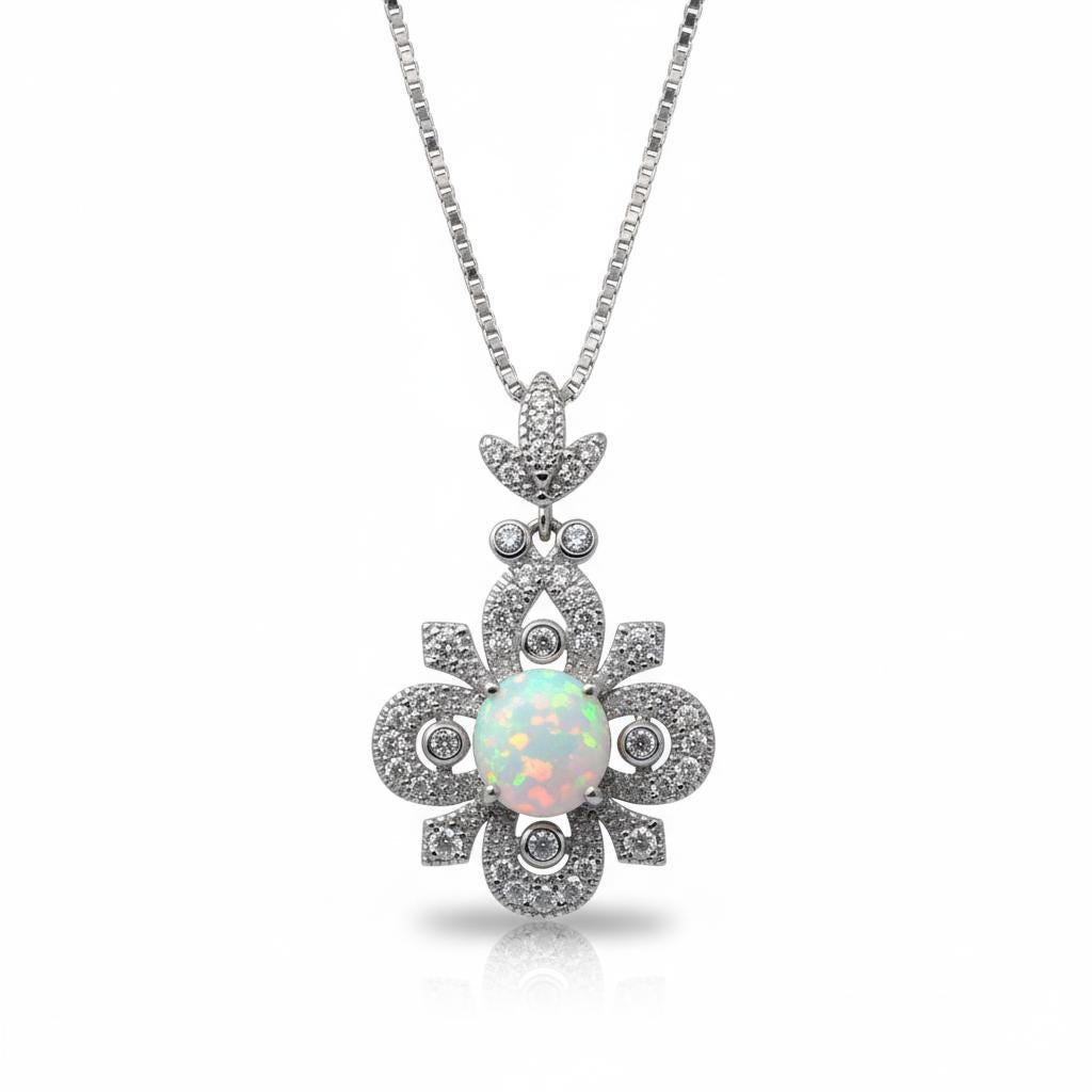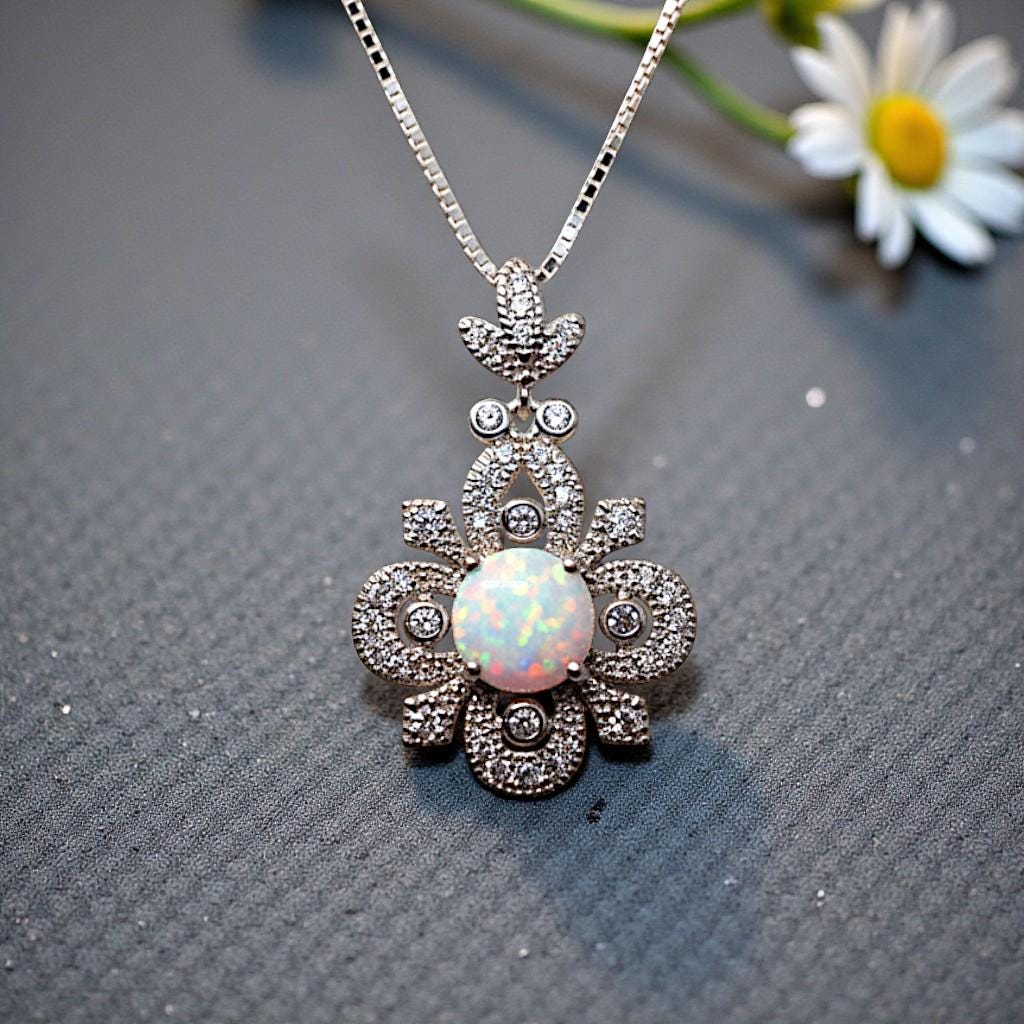 Timeless Floral Design: This pendant features a brilliant 8mm lab-created white opal set in a handcrafted vintage-style floral filigree, symbolizing hope and purity.