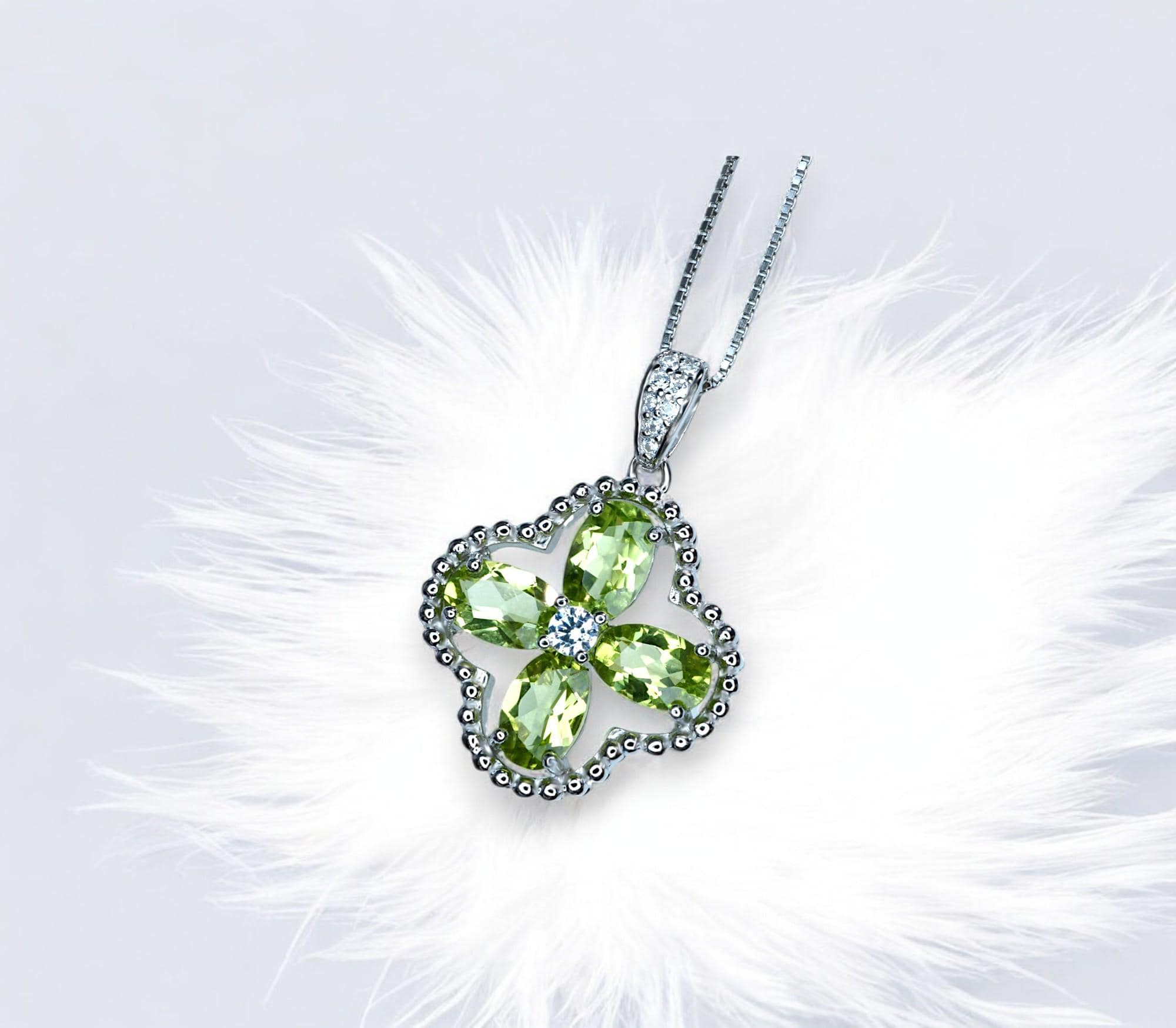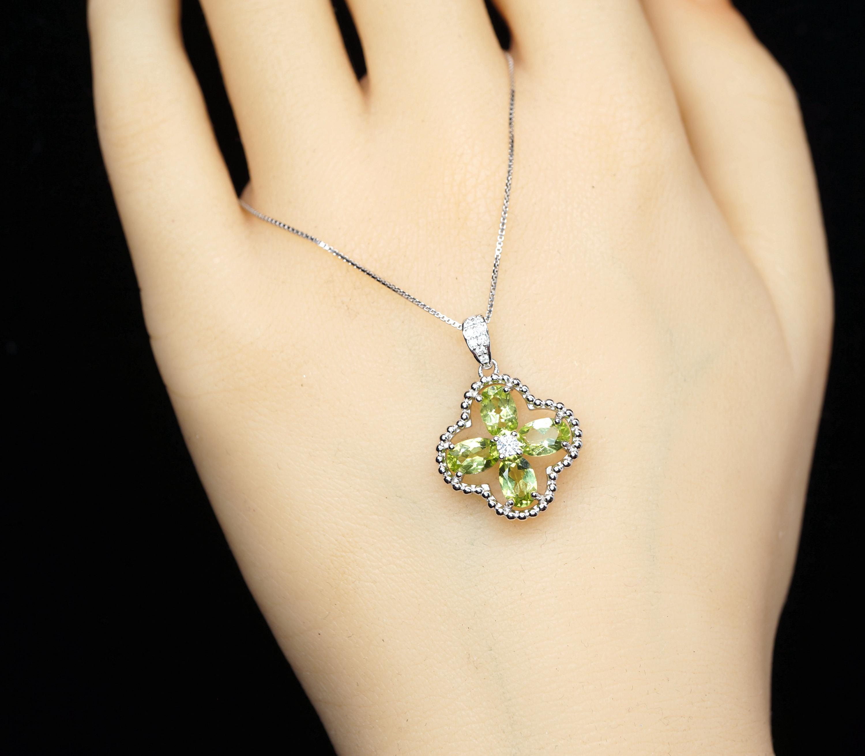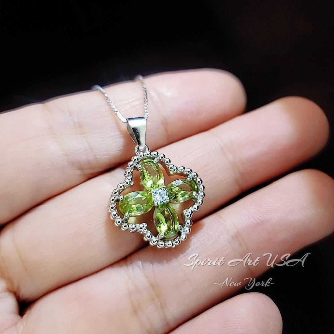 Delicate Green Peridot Four Leaf Clover Necklace, High quality full sterling silver Green peridot jewelry