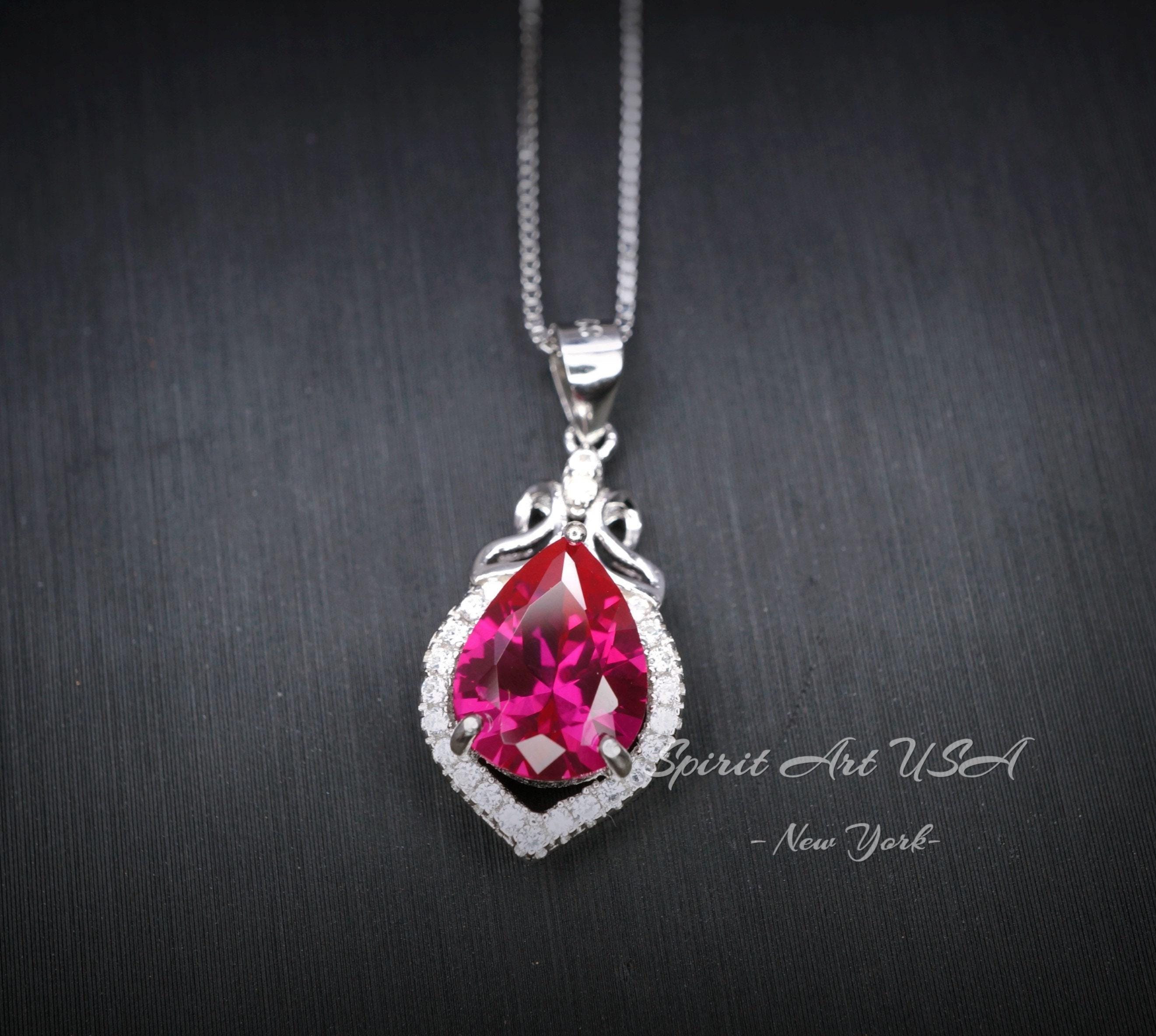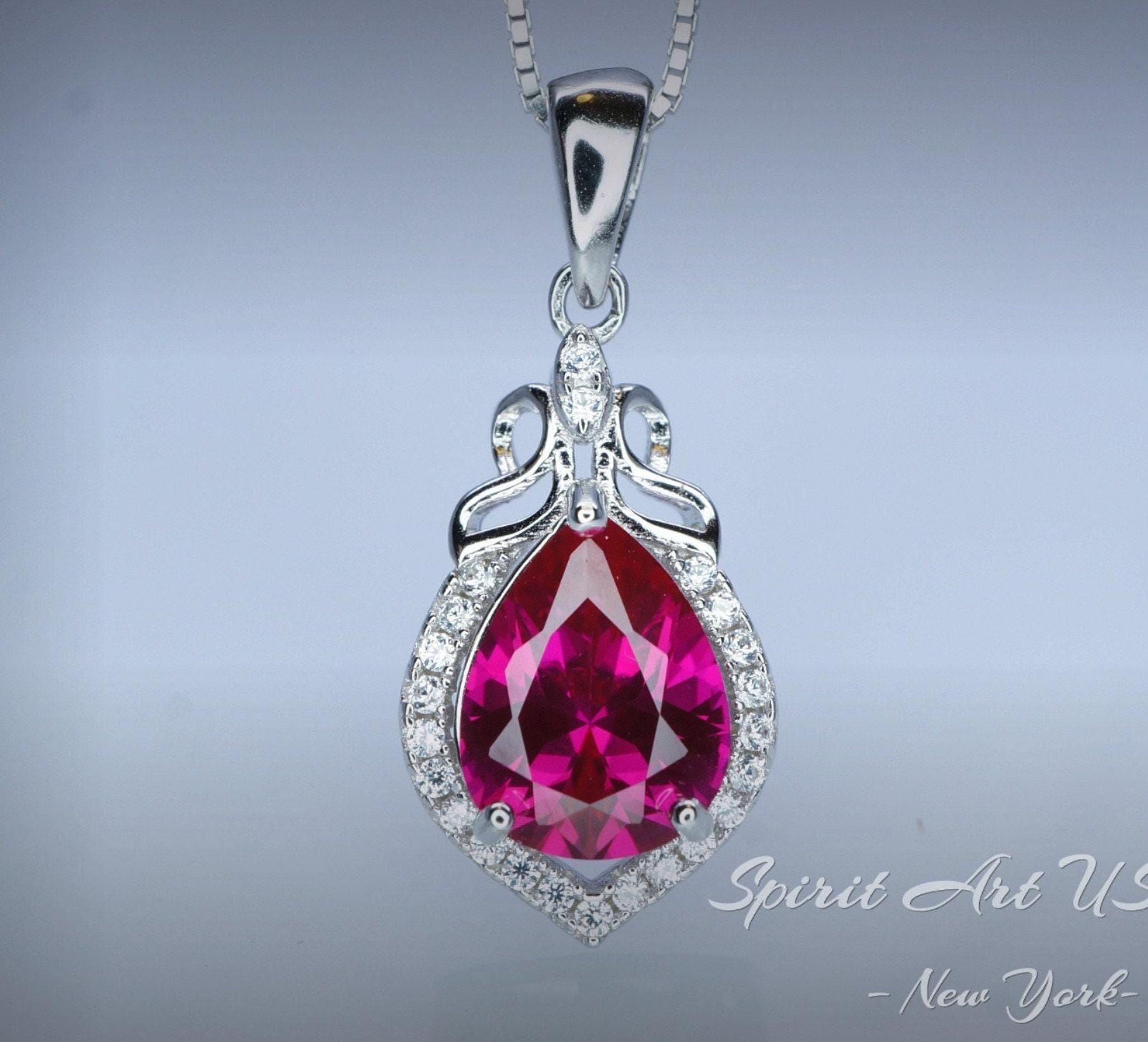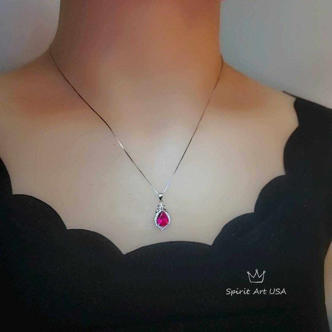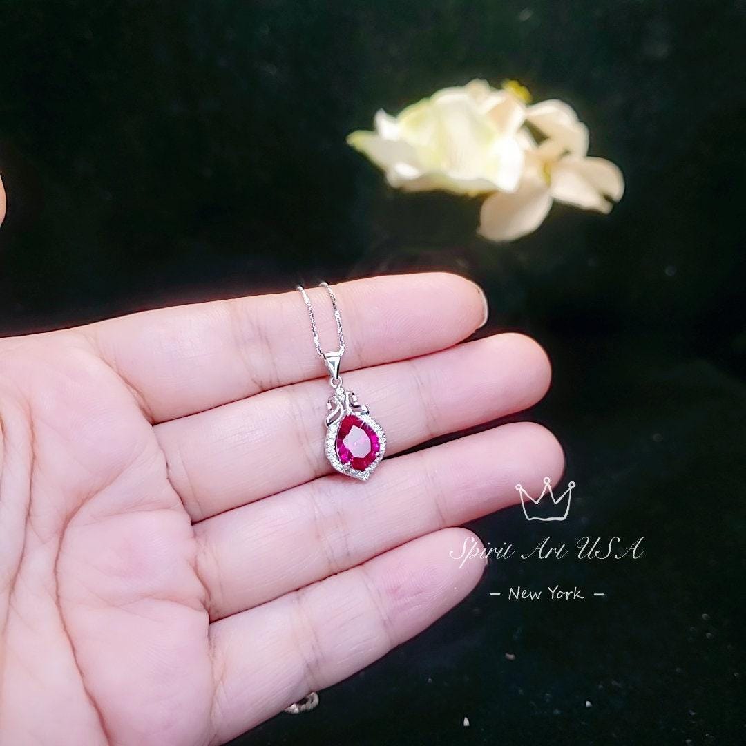 Even prettier in person than in photo! Ruby is a beautiful color and the accent stones are sparkly. Lovely necklace that I'll enjoy for many years