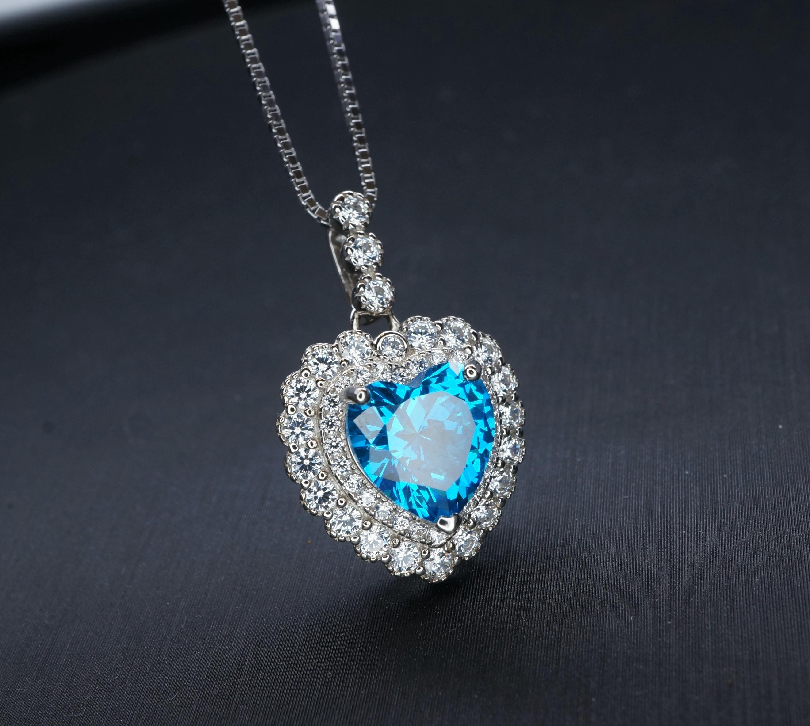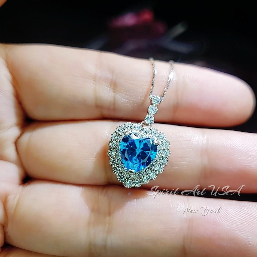 Blue Topaz Necklace , Double Halo Blue Heart Pendant, Ocean Heart Blue Topaz Jewelry, White Gold Sterling Silver